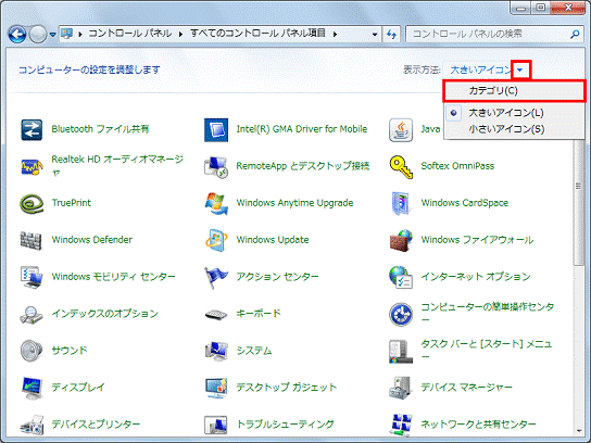 「ハードウェアとサウンド」が表示されていない場合は、「表示方法」の右側の「▼」ボタンをクリックし、表示される一覧から「カテゴリ」をクリックします。