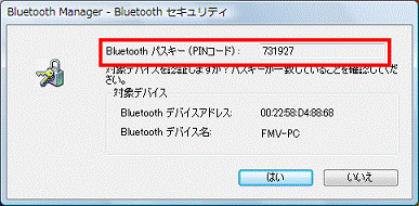 - Windows Vista / Windows XPをお使いの場合は、「Bluetoothパスキー(PINコード)」欄にペアリングコードが表示されます。