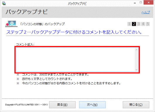 - 「ステップ2…バックアップデータに付けるコメントを記入してください。」と表示されます。