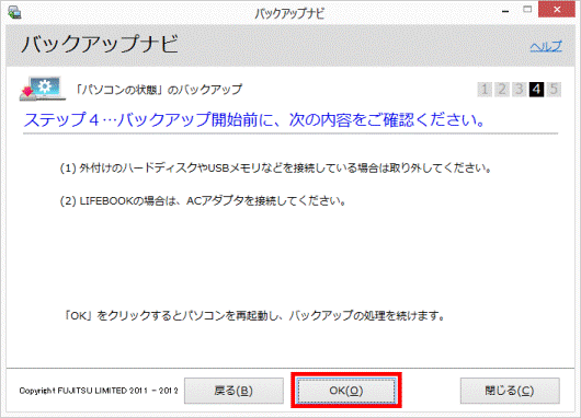 - 「ステップ4…バックアップ開始前に、次の内容をご確認ください。」と表示されます。