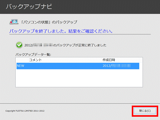 バックアップが正常に完了していることを確認し、「閉じる」ボタンをクリックします。