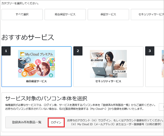 データ復旧保証サービス - 「サービス対象のパソコン本体を選択」の「ログイン」ボタンをクリックします。