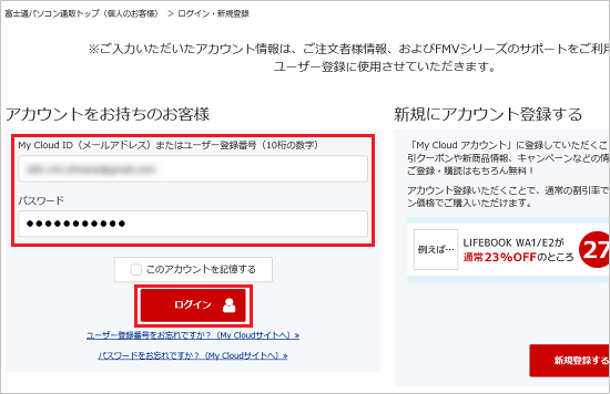 「アカウントをお持ちのお客様」の入力欄に、My Cloud ID、またはユーザー登録番号と、パスワードを入力し、「ログイン」ボタンをクリックします。