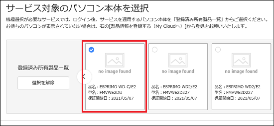 - 「サービス対象のパソコン本体を選択」の中から、データ復旧保証サービスを申し込むパソコンをクリックし、チェックを付けます。