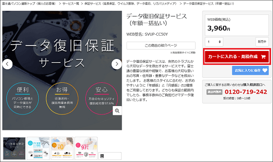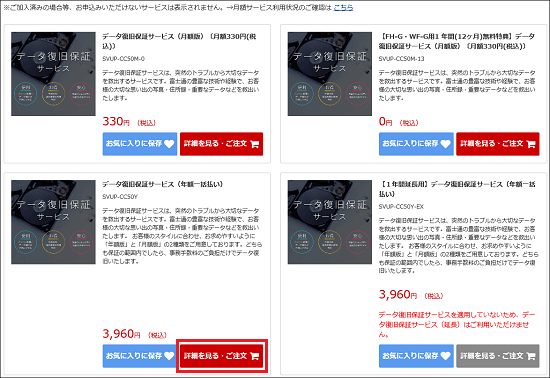 (「データ復旧保証サービス(年額一括払い)」をクリックした例) - 選択したサービスの詳細が表示されます。
