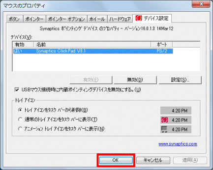 「USBマウス接続時に内蔵ポインティングデバイスを無効にする。」をクリックし、チェックを付けます。