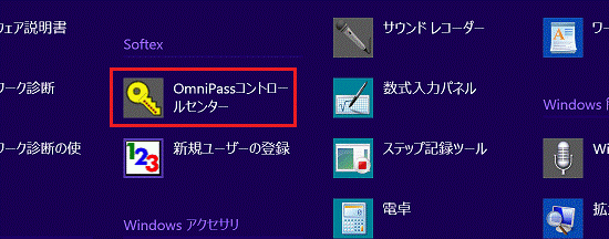 「Softex」の「OmniPassコントロールセンター」をクリックします。