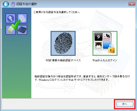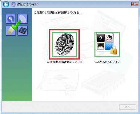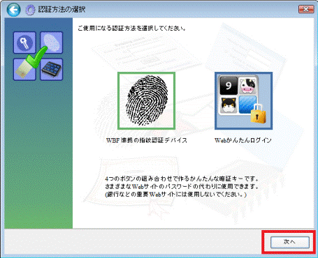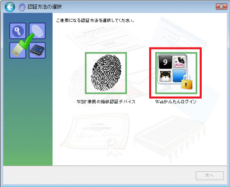 「Windows パスワードの更新」と表示される場合は、Windows のパスワードを入力し、「次へ」ボタンをクリックします。 - 「認証方法の選択」と表示されます。