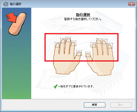 - 「OmniPassでは2本以上の指を登録する必要があります。」または「少なくとも2本の指の登録が必要です。」と表示されます。