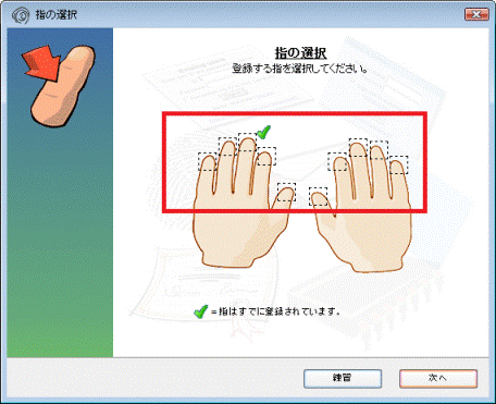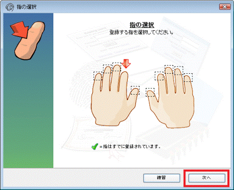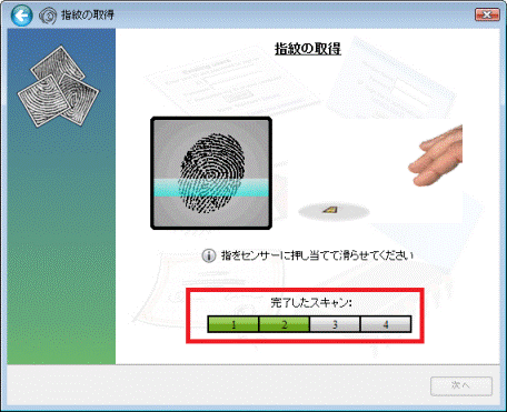 「完了したスキャン」の数字の背景が、すべて緑色になるまで、何度か指紋をスキャンします。