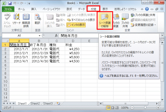 次の手順で、シートの保護を解除します。