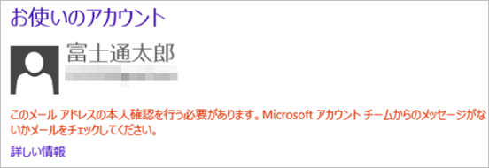 - アカウントの詳細の下に、「このメールアドレスの本人確認を行う必要があります。」と表示されているかどうかを確認します。