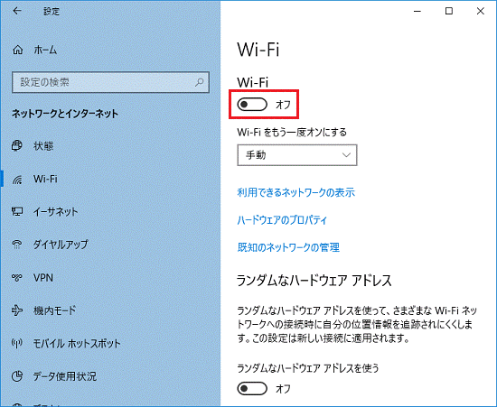 5. 「Wi-Fi」のスイッチが「オフ」になったことを確認します。