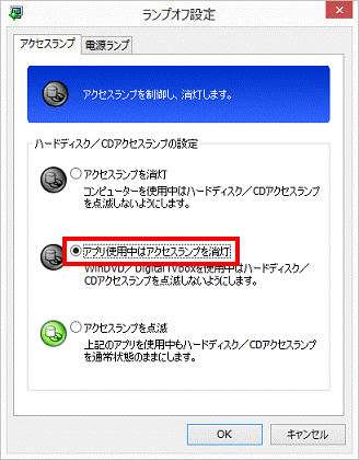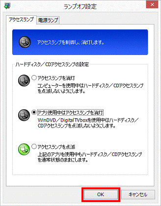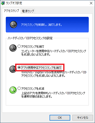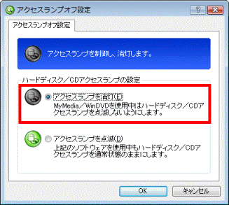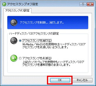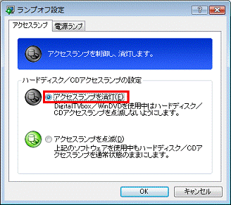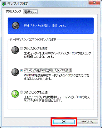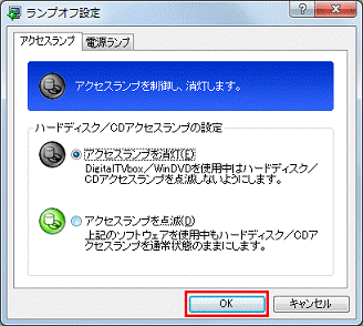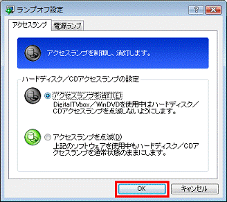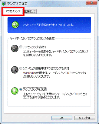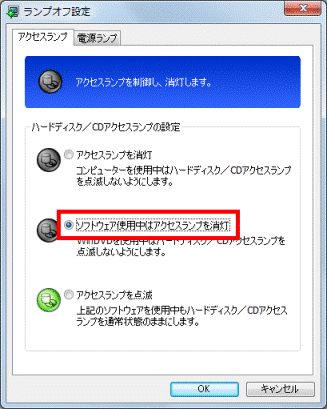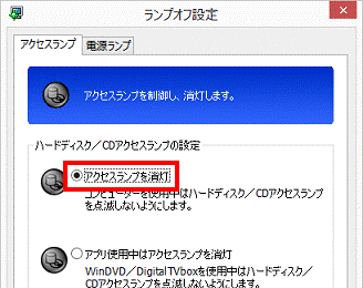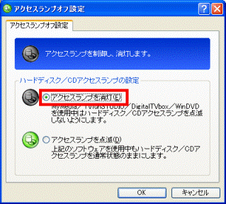 アドバイス- パソコンを使用中はハードディスク / CDアクセスランプを消灯したい場合、「アクセスランプを消灯」をクリックします。