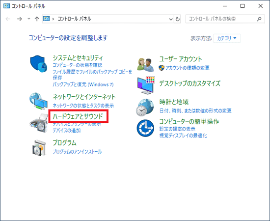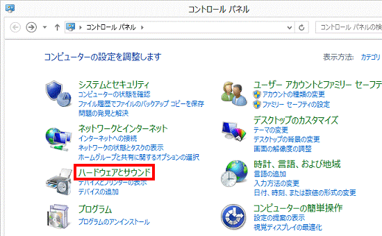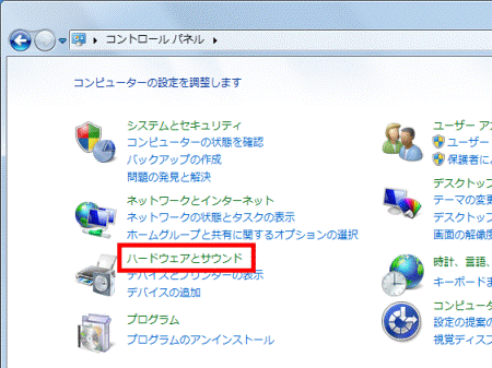 - 「ハードウェアとサウンド」をクリックします。