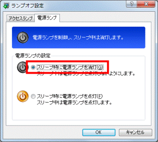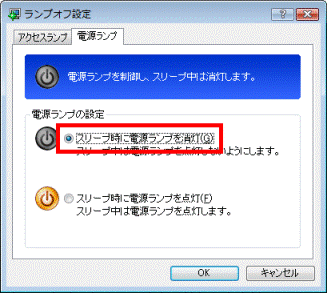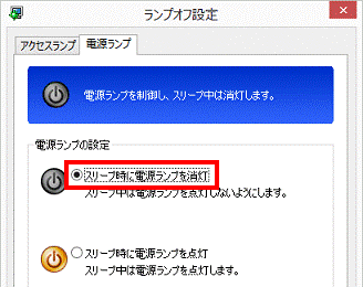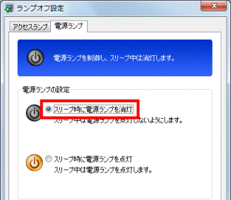 アドバイスパソコンがスリープのときに、電源ランプを消灯したい場合は、「電源ランプ」タブをクリックし、「スリープ時に電源ランプを消灯」をクリックします。