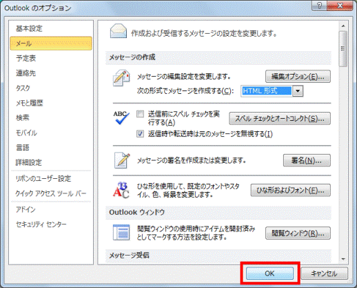 - 「メッセージの作成」の欄にある「▼」ボタンをクリックし、表示されるメニューから使用する形式をクリックします。