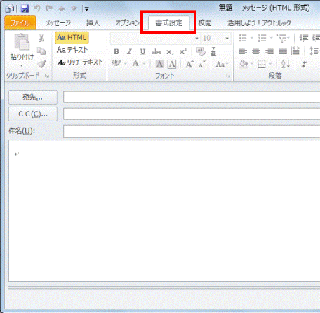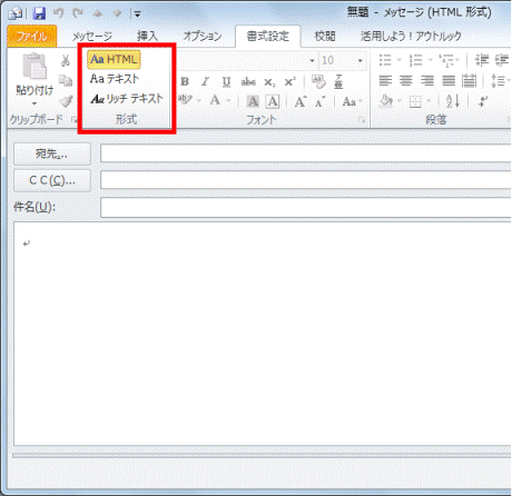 Outlook 2010では、次の方法で、メールの送信形式をテキスト形式やHTML形式に切り替えることができます。