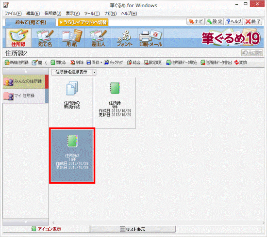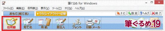 「うら(レイアウト)」タブが選択されている場合は、「おもて(宛て名)へ切替」タブをクリックします。「住所録」ボタンをクリックします。