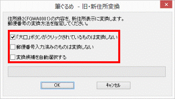 「大口」ボタンが有効になっている宛て名データは、検索された郵便番号で変換しません。郵便番号入力済みのものは変換しない
