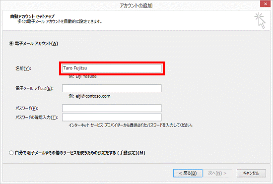 - 「名前」に、このアカウントから送信されるメールの、送信元として表示される名前を入力します。