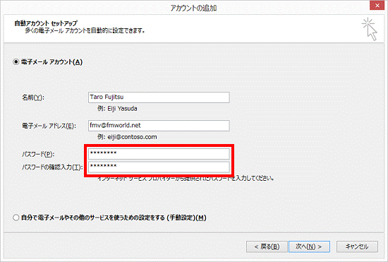 - 「パスワード」と「パスワードの確認入力」に、プロバイダーから指定されているメールパスワードを入力します。