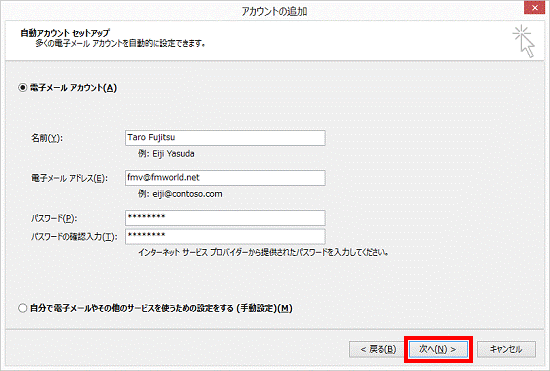 「名前」の欄には、半角英数字の他にひらがな、漢字なども使用できます。 - 「電子メールアドレス」に、プロバイダーから提供されているメールアドレスを入力します。