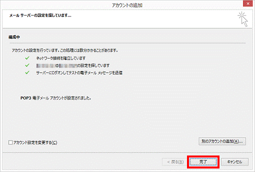 「おめでとうございます。電子メールアカウントの設定が完了し、使えるようになりました。」のいずれかが表示された場合