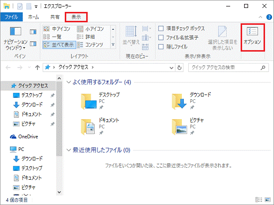 「表示」タブの「オプション」ボタンをクリックします。