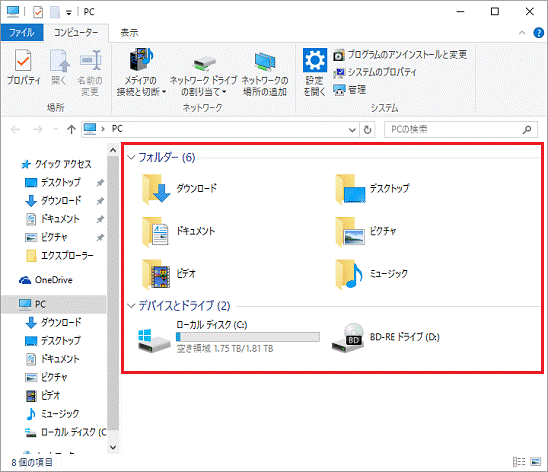 「フォルダー」と「デバイスとドライブ」の項目が表示されていることを確認します。