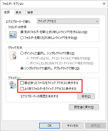 - 「プライバシー」にある、「最近使ったファイルをクイックアクセスに表示する」、「よく使うフォルダーをクイックアクセスに表示する」をクリックし、チェックを外します。