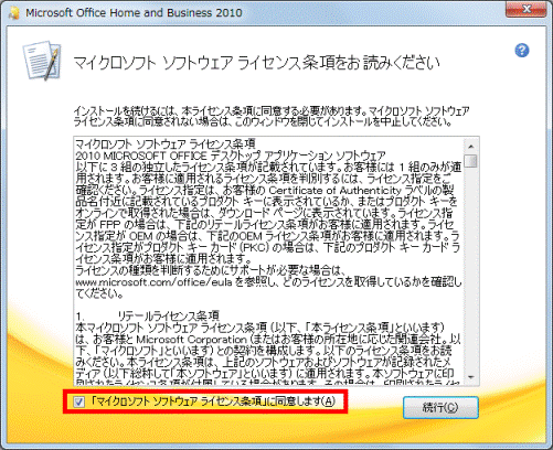 - 「マイクロソフト ソフトウェア ライセンス条項をお読みください」と表示されます。