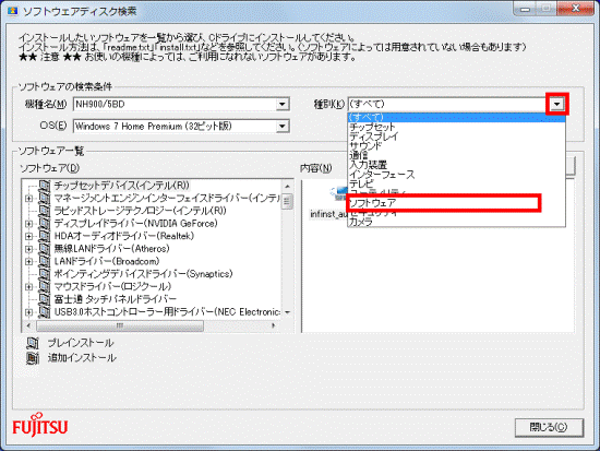 - 「種別」欄の「▼」ボタンをクリックし、表示されるメニューから「ソフトウェア」をクリックします。