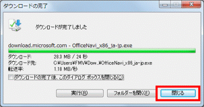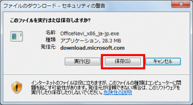 Microsoft Office 2010 64ビット版をインストールした場合は、「64ビット用」の右側にある、「OfficeNavi_x64_ja-jp.exe」をクリックします。 - お使いのInternet Explorerに応じて、次を操作します。