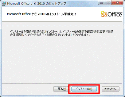 - 「Microsoft Office ナビ 2010のインストール準備完了」と表示されます。
