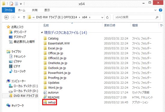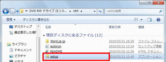ディスクの内容が表示されたら、「x64」フォルダー→「setup」(または「setup.exe」)の順にクリックします。