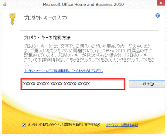 - 「プロダクト キーの入力」と表示されます。