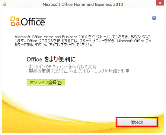 - 「Microsoft Office ナビ 2010 セットアップ ウィザードが完了しました」と表示されます。