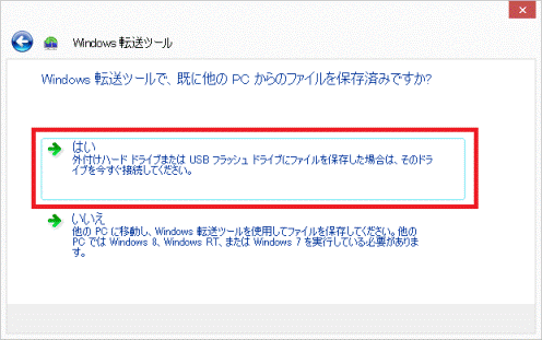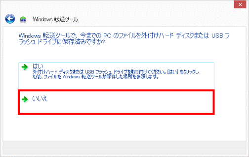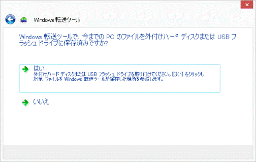 - 「Windows 転送ツールで、今までのPCのファイルを外付けハードディスクまたはUSBフラッシュドライブに保存済みですか?」と表示されます。