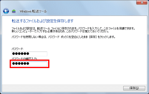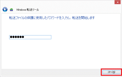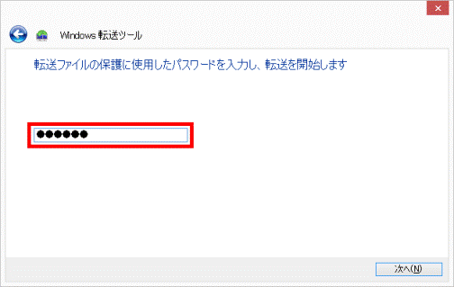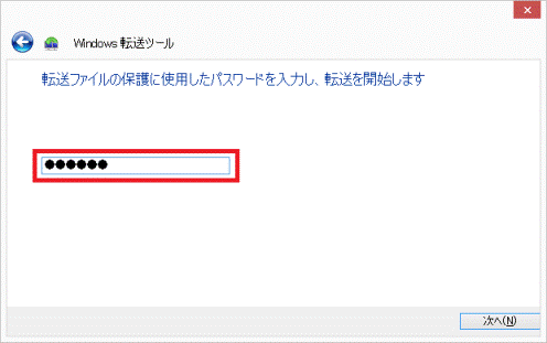 - 「転送ファイルの保護に使用したパスワードを入力し、転送を開始します」と表示された場合は、入力欄に古いパソコンでデータを収集するときに設定したパスワードを入力します。