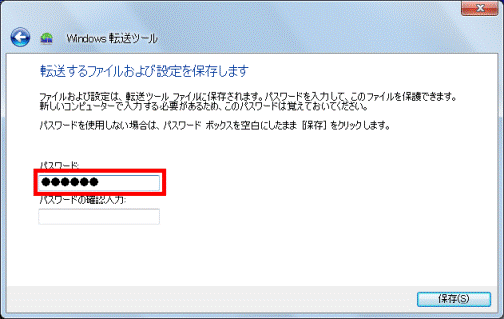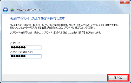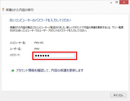- 「保護された内容の移行」と表示された場合は、移行するアカウントの古いパソコンでのログオンパスワードを入力します。