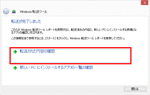 転送された内容を確認したい場合は、「転送された内容の確認」をクリックし、Windows 転送ツール レポートで確認します。