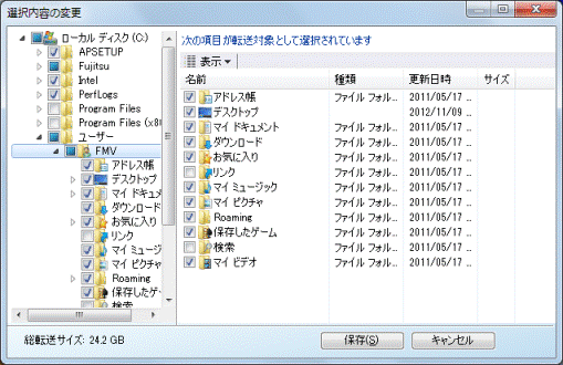 表示された選択項目の下部にある「詳細設定」をクリックすると、「選択内容の変更」が表示され、移行するデータを細かく選ぶことができます。