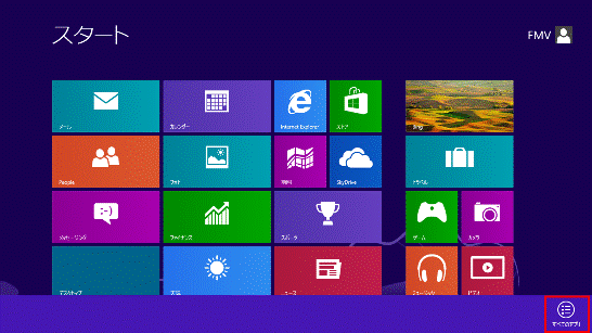 デスクトップの場合は、画面の右下にマウスポインターを移動し、チャームが表示されたら「スタート」をクリックします。 - アプリの一覧が表示されます。
