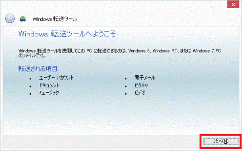 - 「Windows 転送ツールへようこそ」と表示されます。