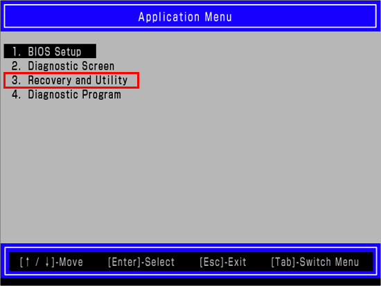 【↓】キーを押し「トラブル解決ナビ」または「Recovery and Utility」にカーソルを合わせて、【Enter】キーを押します。