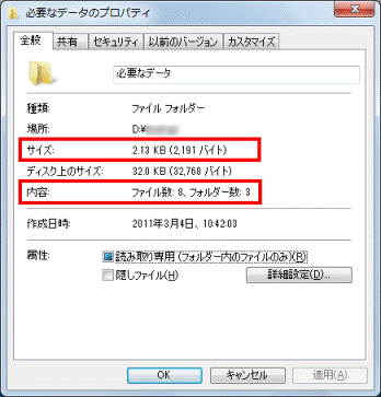 「サイズ」、「内容」をメモします。![[プロパティ] - サイズ、内容を確認](../private/201103/0400000001/030.gif)
