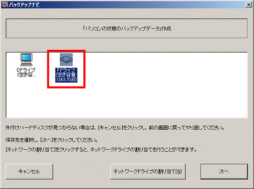 バックアップナビについて教えてください。(新しいウィンドウで表示)バックアップナビでは、「パソコンの状態」(現在のCドライブの状態)をバックアップし、次の場所に保存できます。