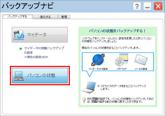 [バックアップナビ] 「パソコンの状態」をバックアップする方法を教えてください。(2011年冬モデル〜2012年夏モデル)