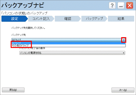 手順6.の「バックアップ先」で選択したドライブによって、手順が異なります。- 「Dドライブ」を選択した場合